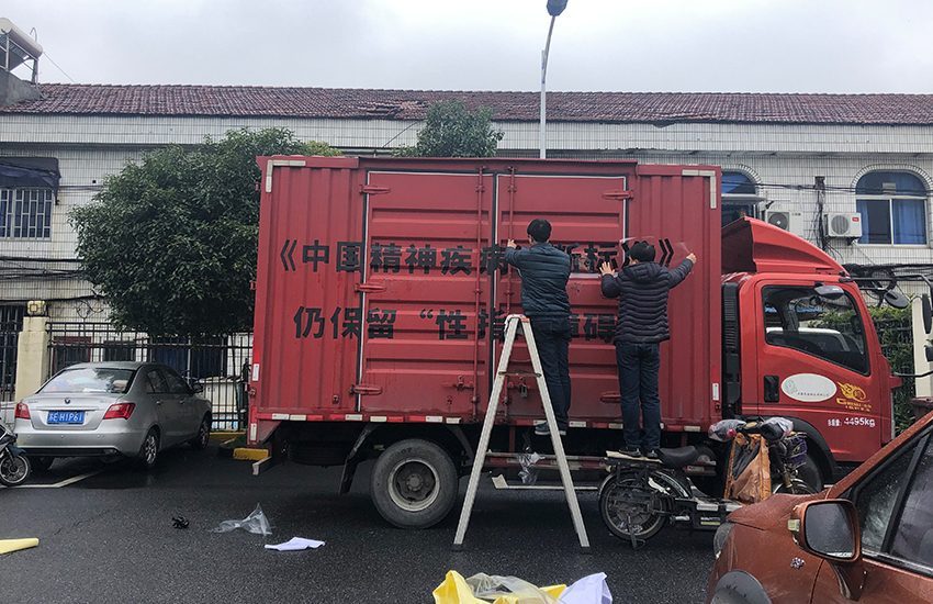 ‘Kriteria diagnostik untuk gangguan mental di Cina masih mempertahankan “Gangguan Orientasi Seksual”, tulis di truk yang lain.