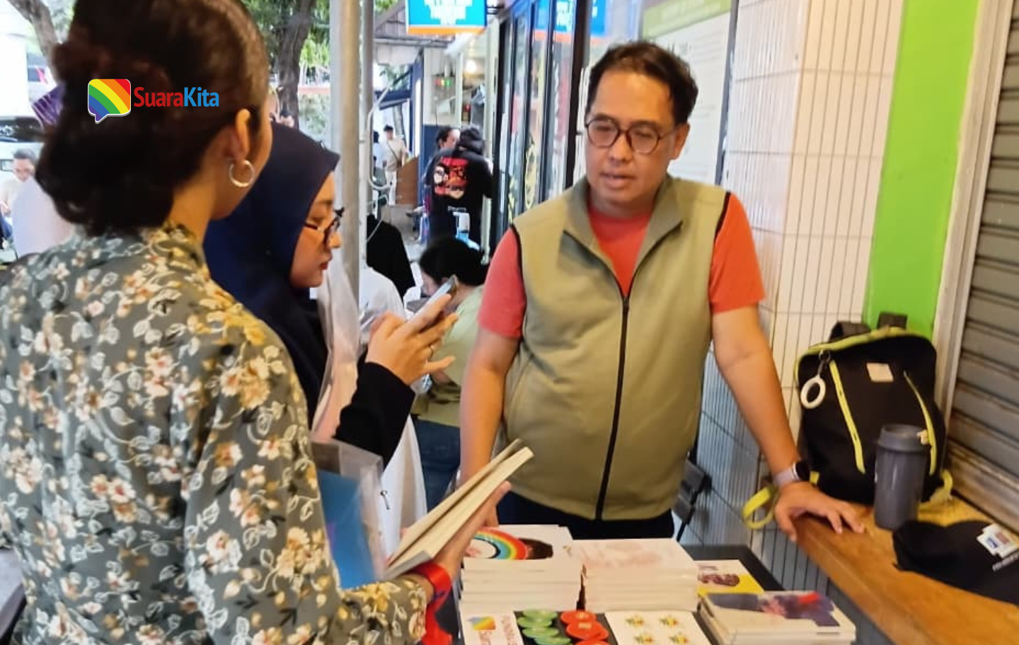 Di tengah semaraknya rangkaian acara, Suara Kita hadir dengan membuka stand Pustaka Pelangi—divisi fundraising yang menyediakan buku-buku bertema keberagaman serta merchandise resmi Suara Kita. Banyak yang mampir terutama generasi Z untuk melihat koleksi buku sekaligus ngobrol.