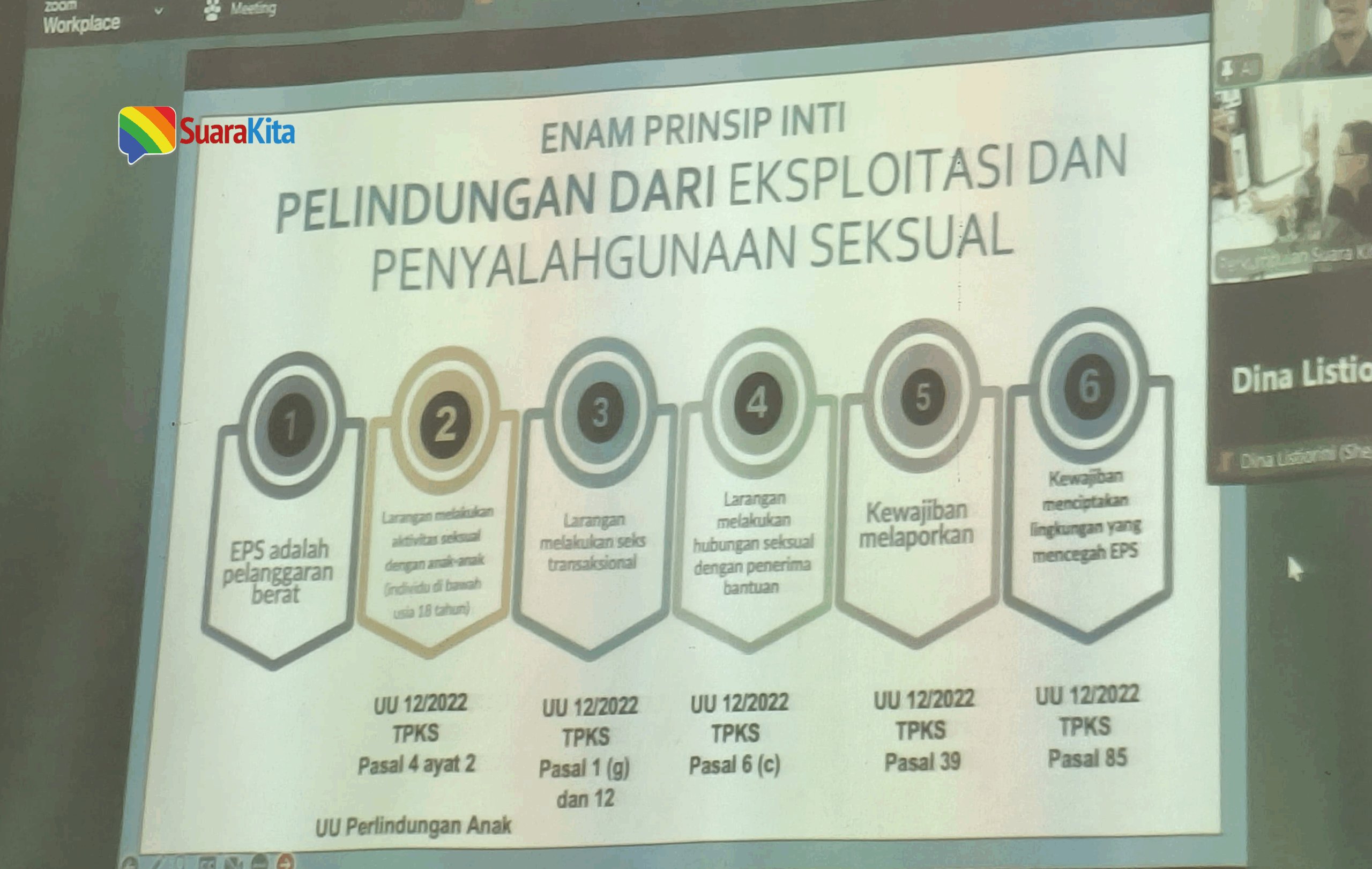 Diskusi kemudian menyinggung enam prinsip PBB tentang pencegahan eksploitasi seksual, termasuk larangan transaksi seksual dan hubungan dengan individu di bawah 18 tahun. Prinsip ini dikaitkan dengan Undang-Undang Perlindungan Anak di Indonesia, menegaskan perlunya lingkungan yang aman. Ali menjelaskan bahwa kebijakan internal organisasi harus sejalan dengan hukum nasional.