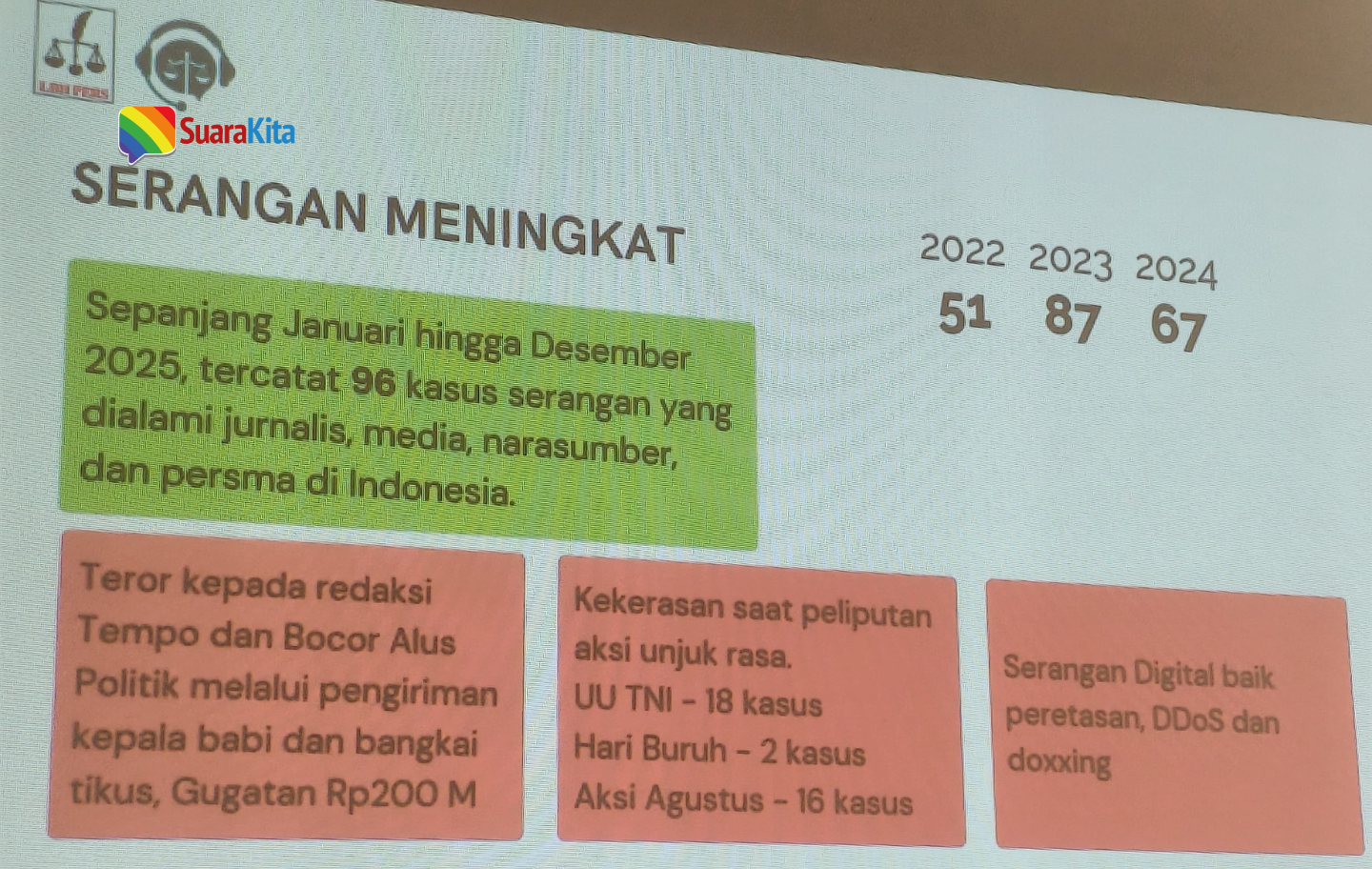 Pelatihan berlangsung dalam suasana tertutup. Sejak hari pertama, materi yang disampaikan menyoroti tantangan serius yang dihadapi jurnalis di Indonesia. Mustafa selaku Direktur LBH Pers membuka sesi dengan paparan mengenai pola kriminalisasi dan pengawasan digital terhadap jurnalis. Ia menekankan bahwa ancaman hukum sering digunakan sebagai alat intimidasi, sehingga jurnalis perlu memahami pola-pola tersebut agar tidak mudah terjebak.